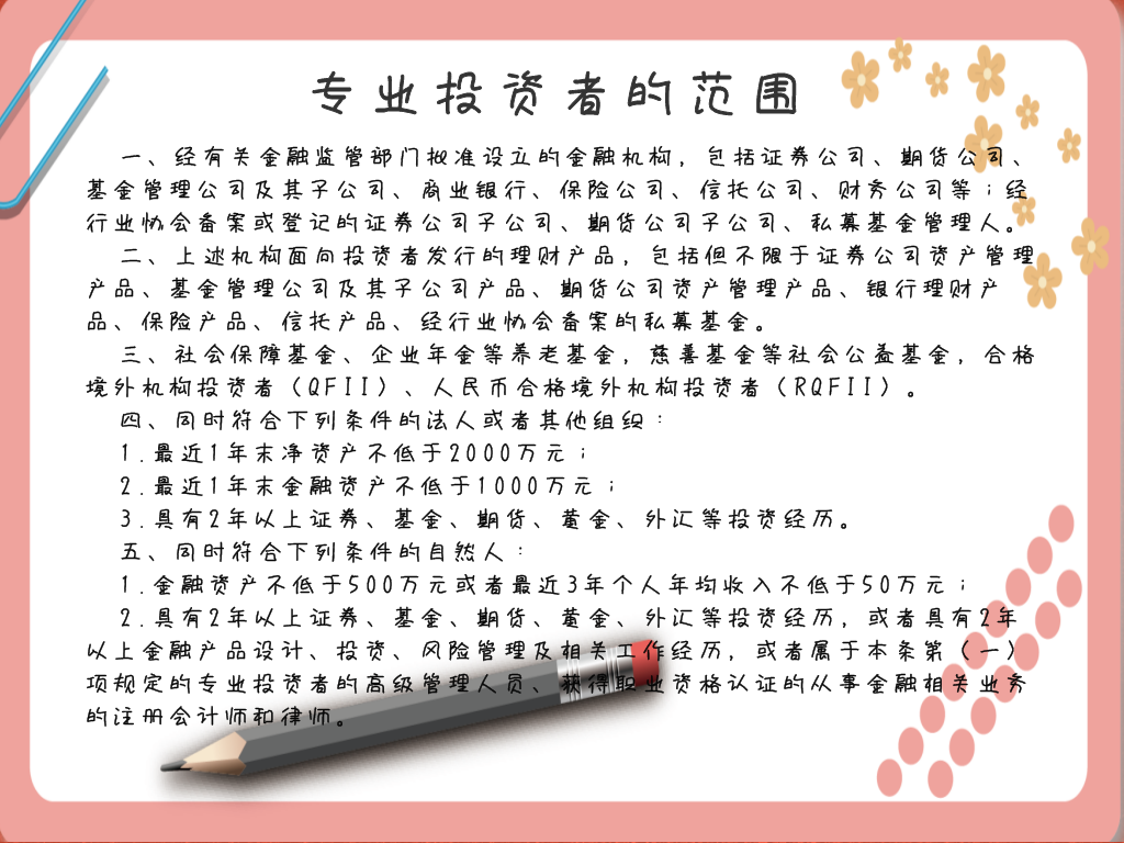 《证券期货投资者适当性管理办法》也对专业投资者有明确的规定,若干投资者对设定投资门槛有疑义,甚至对投资ST股票,创业板,科创板 天堂影院,融资融券以及新三板设定门槛有意见,觉得国家把他发财致富通向成功的大门堵住了,殊不知,门槛是限制,更是保护,或许让你倾家荡产的时候还有一块遮羞布,与其抱怨自己没有资格,还不如“先设定一个小目标”,成为专业投资者,进而提升资金实力,投资能力,增强抗风险能力,同时优化投资组合,综合配置期货,股票,基金,债券,现金管理产品以及不断推出如REITs之类的新产品,并在市场变化和波动中动态调整, 。